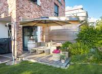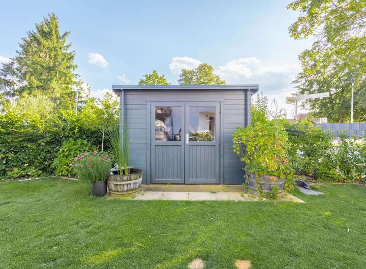 Vom Wohnbereich aus führt eine Tür auf die teilüberdachte Terrasse, die nahtlos in den privaten Garten übergeht – ein besonderer Bonus dieser Wohnung. Der Garten wurde pflegeleicht angelegt, ist eingefriedet durch einen modernen Stabmattenzaun und erhält dank der Hainbuchenhecke einen natürlichen Sichtschutz. Ein Gartenhaus, ein Rasenmähroboter sowie eine Bewässerungsanlage ergänzen den hohen Wohnkomfort und machen die Außenfläche zu einem entspannten Ort für Alltag und Freizeit. 🌿🌞
