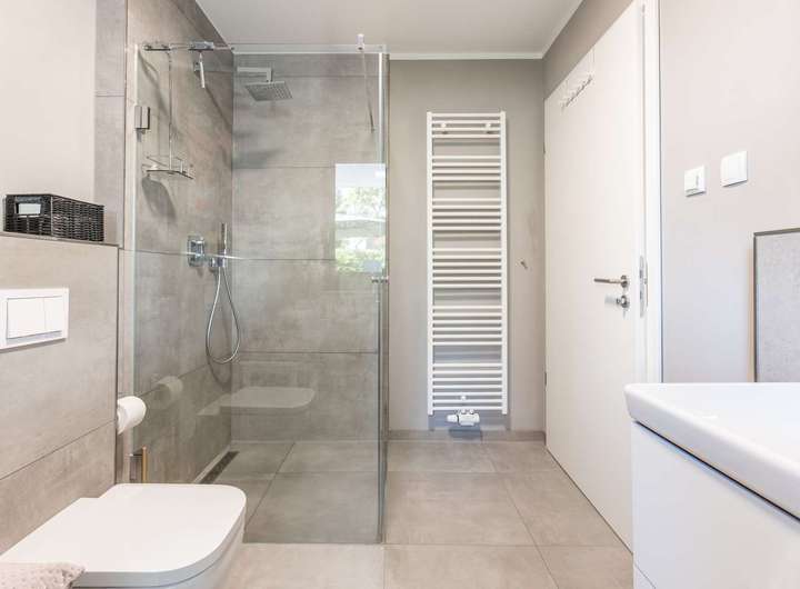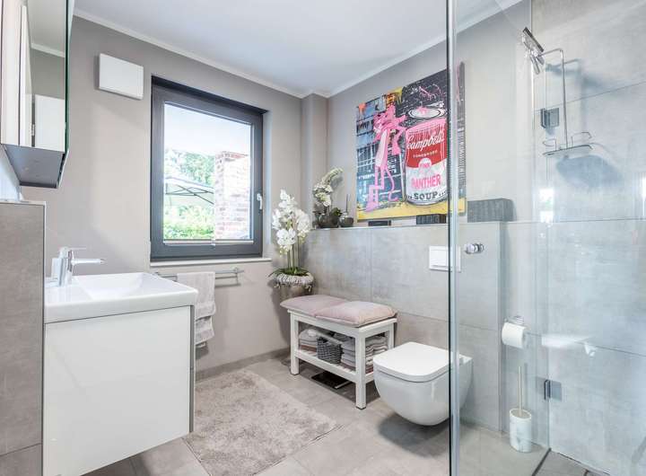 Das elegante Hauptbadezimmer überzeugt mit bodentiefer Glasdusche, stilvollen Fliesen, hochwertigen Armaturen und einer barrierefreien Gestaltung. 🚿