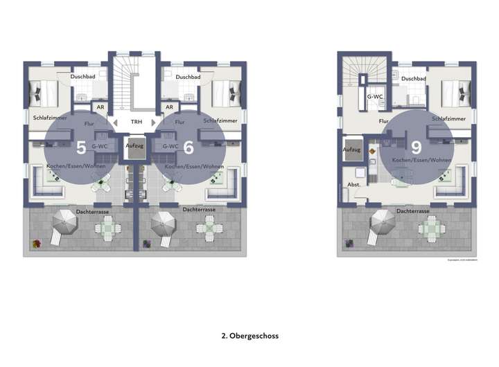 Das Projekt umfasst zwei Baukörper, die ähnliche Wohnkonzepte bieten. Baukörper I beherbergt sechs Wohneinheiten und bietet durch die Unterkellerung einen praktischen Mehrwert: Es gibt einen gemeinschaftlichen Waschkeller und jede Wohnung verfügt über einen eigenen Kellerraum. Baukörper II mit drei Wohneinheiten verzichtet auf eine Unterkellerung, dafür sind die Wohnungen hier etwas großzügiger geschnitten und bieten eine besonders private Wohnatmosphäre