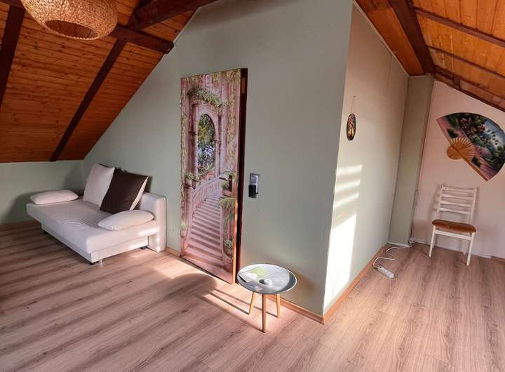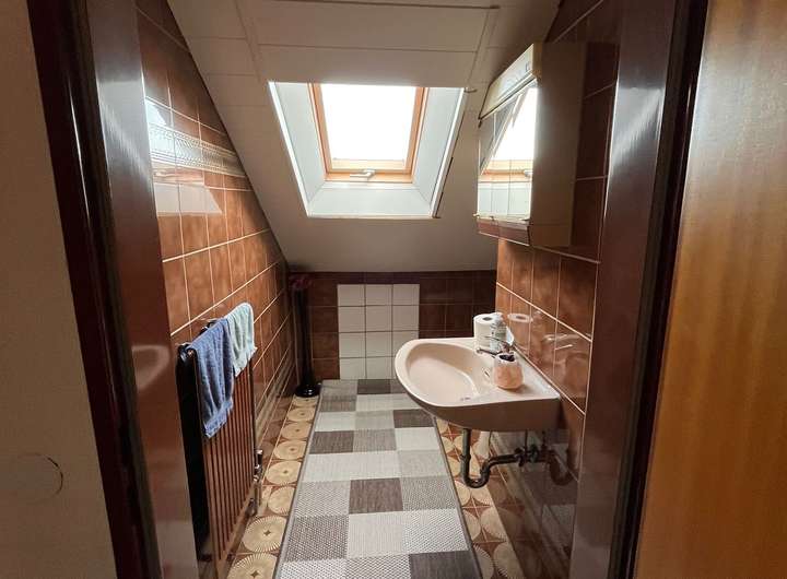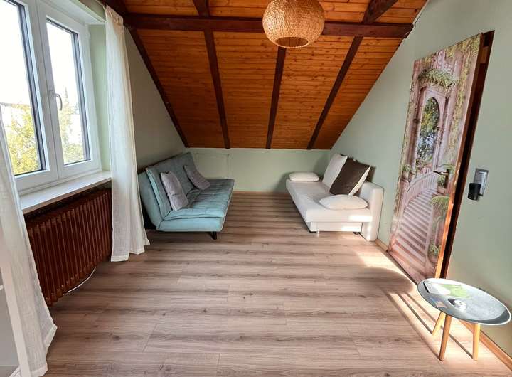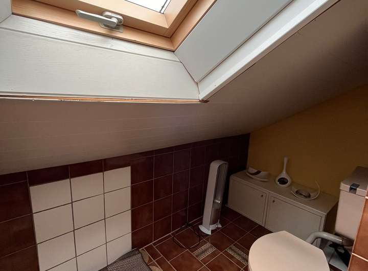 - Dachgeschoss: Flur, 1 Zimmer mit 2 Fenstern (West- und Südseite), Gäste WC mit Dachfenster.