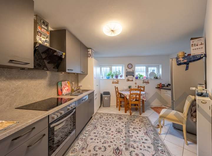 Im Erdgeschoss empfängt Sie ein Eingangsbereich mit Zugang zum Obergeschoss, einer Garderobe sowie einer Gästetoilette. Von hier aus öffnet sich der großzügige Wohnbereich, der sich gut als kombinierter Wohn und Essraum nutzen lässt und ausreichend Platz für den Alltag sowie gemeinsame Stunden bietet. Angrenzend befindet sich die Küche mit moderner Einbauküche aus dem Jahr 2024.