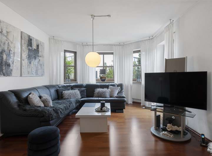 Beim Betreten der Wohnung gelangen Sie in den einladenden Flur. Direkt angrenzend befindet sich ein Gäste-WC, welches aktuell als Garderobe/Abstellkammer genutzt wird. Der besondere runde Durchgang im Flur führt direkt zum Herzstück der Immobilie: Dem offenen Wohn-, Ess- und Kochbereich, der durch seinen außergewöhnlichen Grundriss eine besondere Wohnatmosphäre schafft. Die hochwertige Einbauküche ist mit einer Dunstabzugshaube, einem Siemens-Kochfeld sowie einem Siemens-Backofen auf Hüfthöhe ausgestattet und verbleibt in der Wohnung. Vom Essbereich aus haben Sie Zugang zum schönen, teilweise überdachten Balkon, der durch seine Begrünung sichtgeschützt ist und einen angenehmen, privaten Außenbereich bietet. In allen Wohnräumen wurde ein hochwertiger Echtholzboden verlegt, was den warmen und modernen Charakter der Wohnung zusätzlich unterstreicht. Das Tageslichtbadezimmer überzeugt mit einer passgenauen Eckbadewanne mit Duschfunktion, einem Handtuchheizkörper sowie einem integrierten Waschmaschinenanschluss und bietet damit sowohl Komfort als auch Funktionalität. Beheizt wird die Einheit wahlweise über Fußbodenheizung oder Heizkörper.
