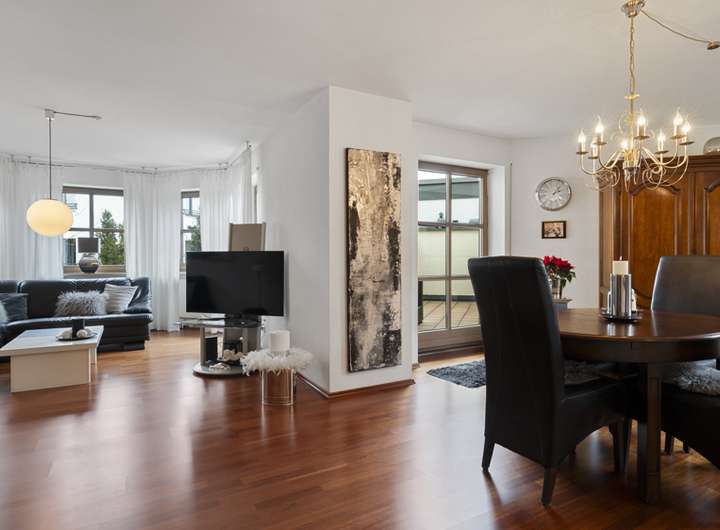 + Eleganter dunkler Echtholzparkett für ein warmes Wohnambiente