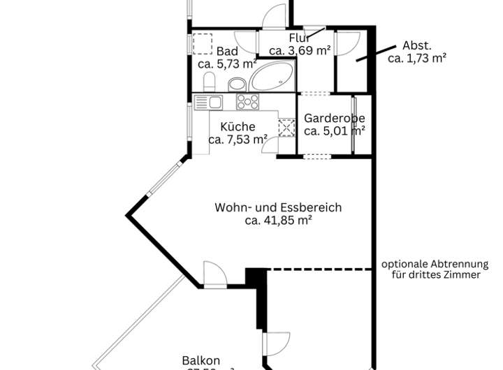 + Optionaler Umbau zur 3-Zimmer-Wohnung (bspw. mit einer Glaswand und Tür)