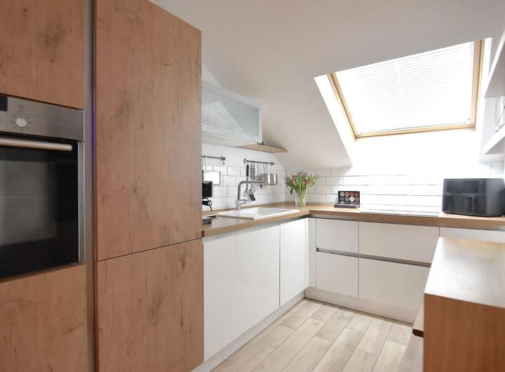 Separate Küche mit einer hochwertigen, geschmackvollen Einbauküche. Diese ist mit folgenden Markengeräten ausgestattet: Kühlschrank mit separatem Gefrierfach mit 2 Schubladen (Marke: Bauknecht ), Backofen (Marke: Siemens), Induktionsfeld mit 4 Kochfeldern (Marke: Bauknecht), Spülmaschine (Marke: Siemens), weißes Spülbecken.