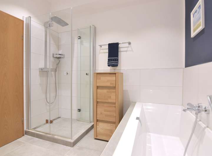 • Badewanne und bodentiefe Dusche mit Glasabtrennung und