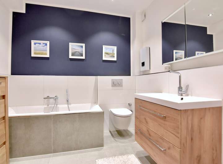 hochwertigen Grohe-Armaturen ausgestattet. Wände sind glatt verputzt, weiß+ dunkelblau gestrichen und in den Nassbereichen weiß gefliest. Der Fußboden ist mit hellgrauen Fliesen ausgelegt. Ein zusätzliches Gäste-WC ist vorhanden.