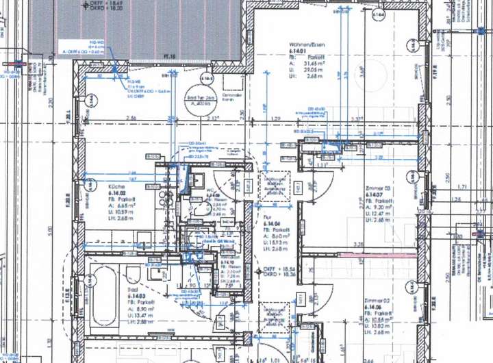 Die Wohnräume sind mit Parkettboden in Dielenoptik ausgestattet, die Wände sind gespachtelt, und die Kunststofffenster sind dreifach verglast. Die Deckenhöhe beträgt ca. 2,60 m, im Flur ca. 2,70 m, welcher zusätzlich mit einem Oberlicht versehen ist. Beheizt wird die Wohnung mittels einer Fußbodenheizung.