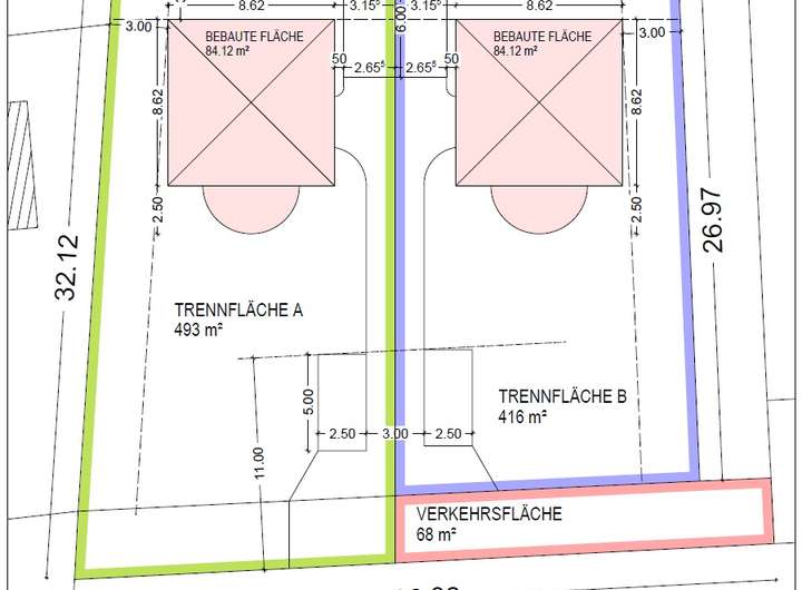 Es existiert ein aus zwei Flurstücken bestehendes Gesamtgrundstück mit einer Größe von ca. 978 m². Durch eine noch vorzunehmende Teilung werden daraus zwei Teilgrundstücke und eine gemeinsame Verkehrsfläche gebildet. (siehe Übersichtsplan Teilung)