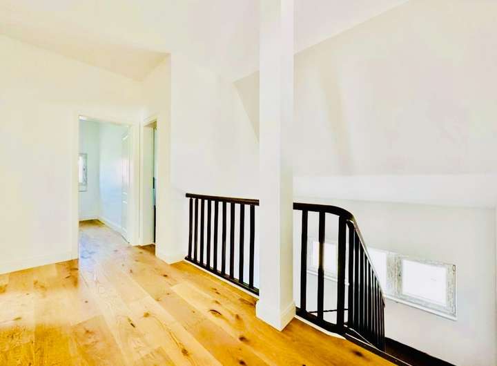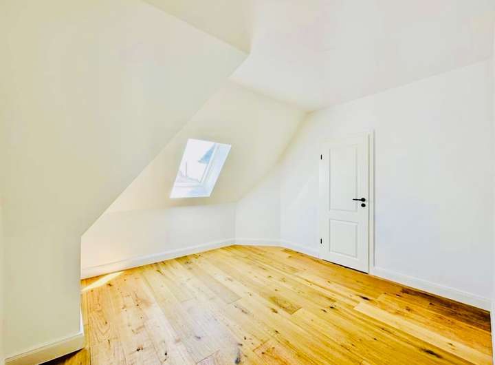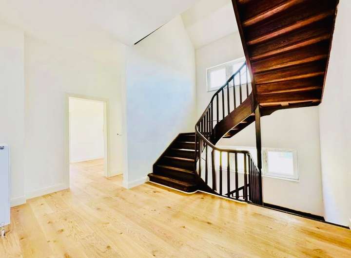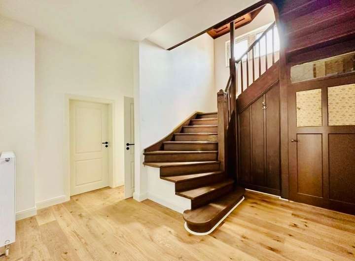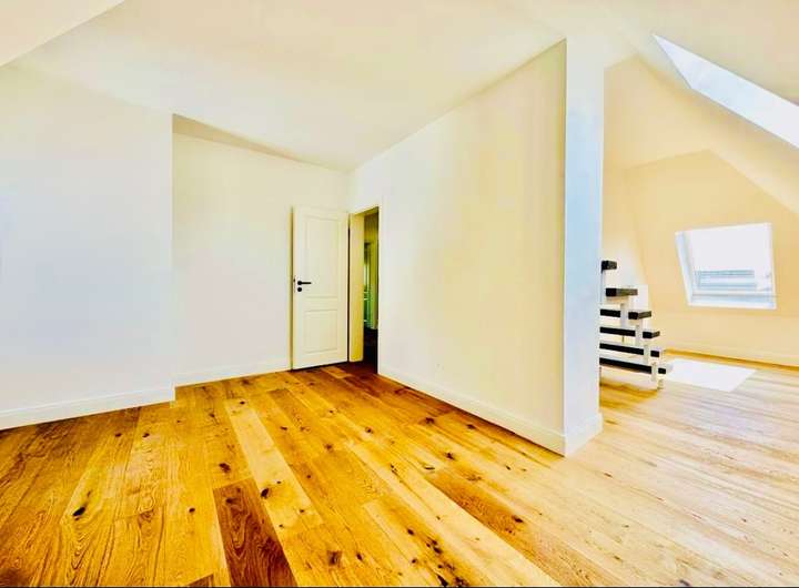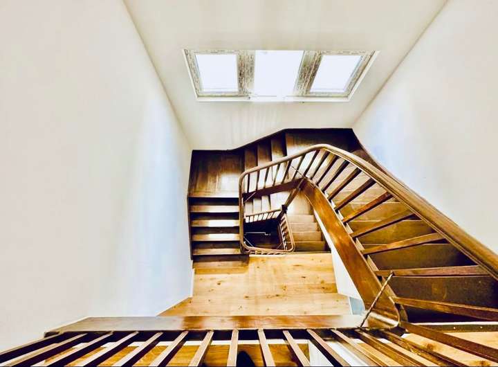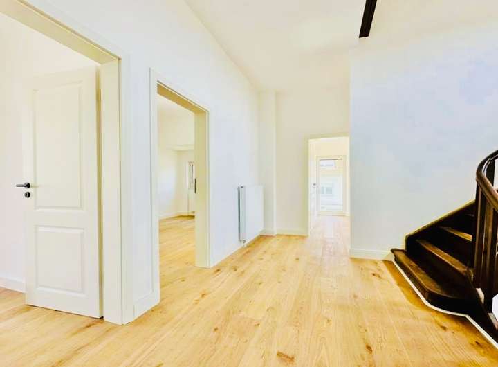 Besonderen Wert legte der Eigentümer auf die Verbindung aus historischem Charakter und moderner Anmutung. Originale Elemente wie das seltene Mansarden-Walmdach, das teilweise mit Naturschiefer neu eingedeckt wurde, sowie die restaurierte massive Echtholztreppe blieben erhalten und wurden mit großem Aufwand überarbeitet. Gleichzeitig wurde der Innenraum mit hochwertigen Materialien ausgestattet, darunter Echtholz-Eichenparkett in allen Wohnräumen sowie massive Berliner Sockelleisten, die dem Altbau seine elegante Raumwirkung zurückgeben.