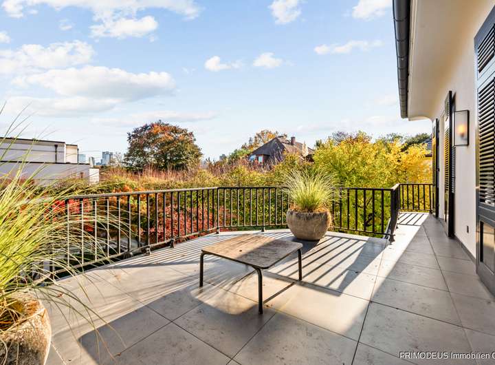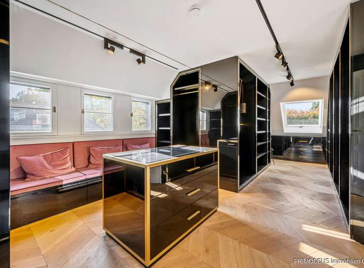 Im ersten Obergeschoss befinden sich Kinder-, Arbeits- und Spielzimmer, teils mit eigenen Bädern. Die Master-Ebene im Dachgeschoss bietet Schlafzimmer, Ankleide, zwei Marmor-Bäder und eine Terrasse mit Skylineblick. Das ausgebaute Dachgeschoss dient als großzügiger Ankleide- oder Rückzugsbereich.