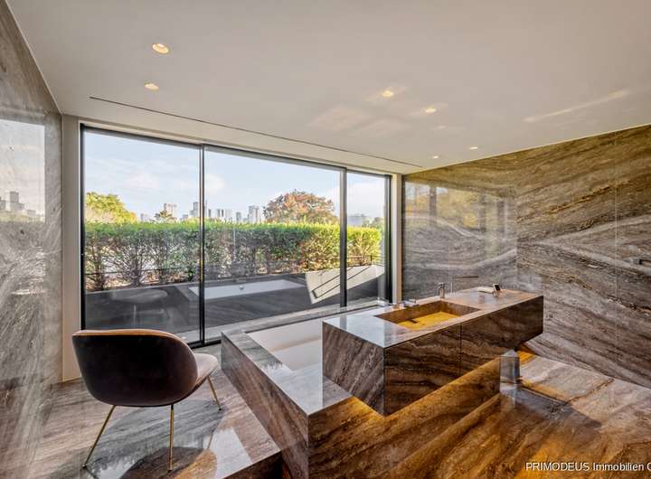 Technologisch auf höchstem Niveau ausgestattet, überzeugt die Villa außerdem mit modernem Smart-Home-System, umfassender Sicherheits- und Videotechnik sowie einer Tiefgarage mit Doppelparker und E-Ladestation.