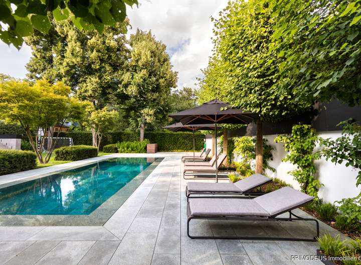 Der Wohn- und Essbereich mit Marmorkamin, Eichentafelparkett und Wintergarten bildet das Herzstück des Hauses. Die hochwertige Einbauküche, die Terrasse und der gepflegte Garten mit Pool schaffen ein Ambiente von Luxus und Behaglichkeit.