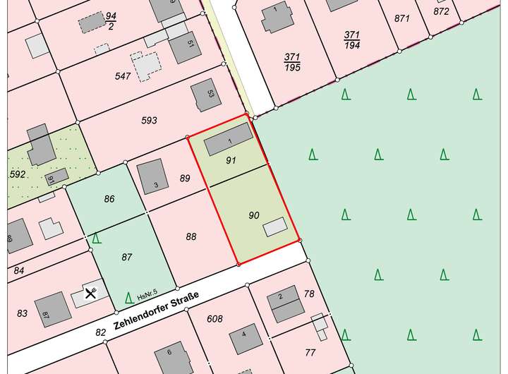 Das Flurstück 90 liegt direkt an der öffentlichen Verkehrsfläche Zehlendorfer Straße an. Es ist straßenseitig mit einem Metalltor und seitlich jeweils mit einem Maschendrahtzaun umzäunt. Eine Einfriedung zum angrenzenden - dahinter liegenden - Flurstück 91 besteht nicht. Das 723 m² große, rechteckig geschnittene Grundstück hat eine Straßenfrontlänge von ca. 24 m und eine Grundstückstiefe von ca. 31 m.