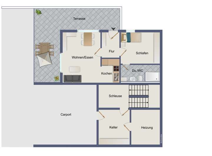 Im Untergeschoss befinden sich zudem noch ein Kellerraum und der Heizungsbereich. Für Fahrzeuge steht ein praktischer Doppel-Carport zur Verfügung.