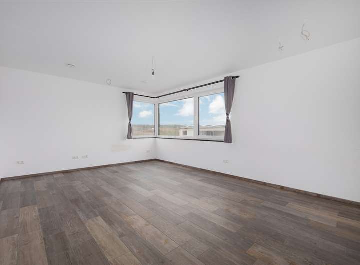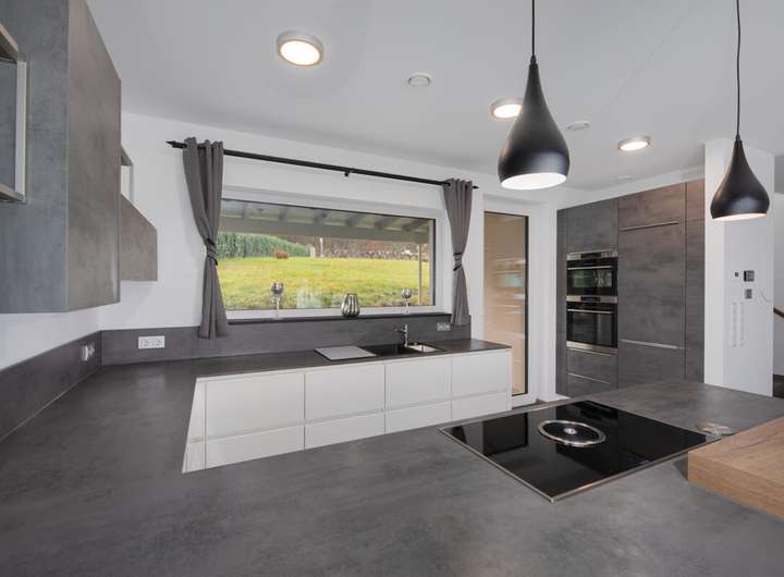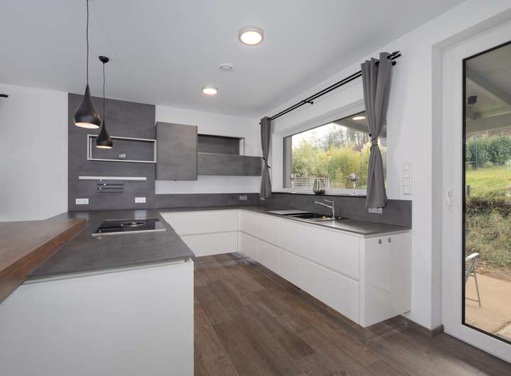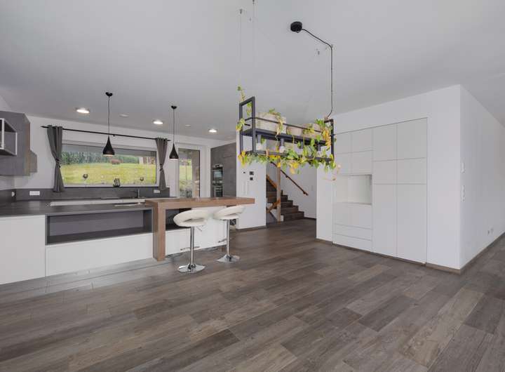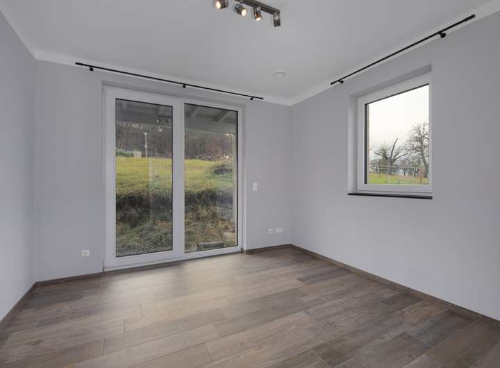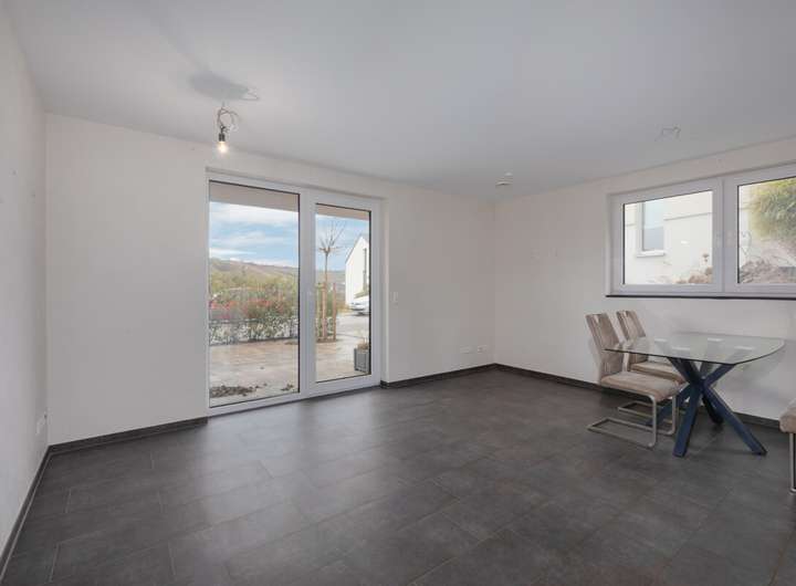 Im Haupthaus erwartet Sie im Erdgeschoss ein großzügiger Wohn-, Ess- und Kochbereich mit hochwertiger Einbauküche. Große Fensterflächen schaffen eine lichtdurchflutete Atmosphäre und bieten direkten Zugang zu den Terrassen – sowohl auf der Vorder- als auch auf der Rückseite des Hauses. Ein Gäste-WC sowie ein flexibel nutzbares Zimmer, das sich beispielsweise als Büro oder Gästezimmer eignet, ergänzen diese Etage.