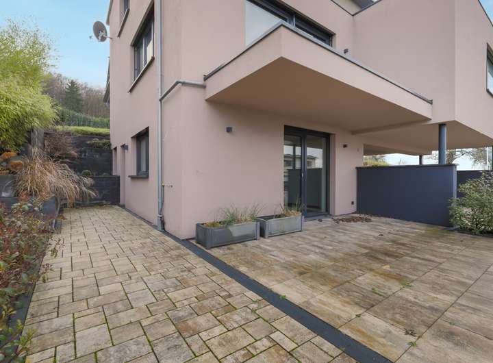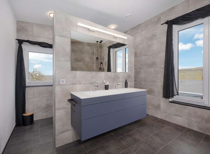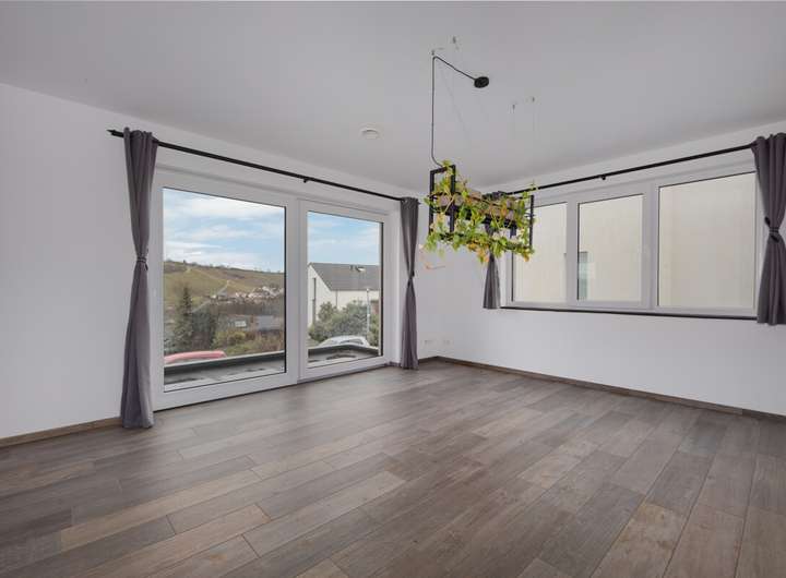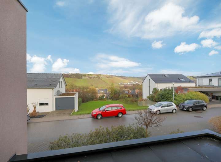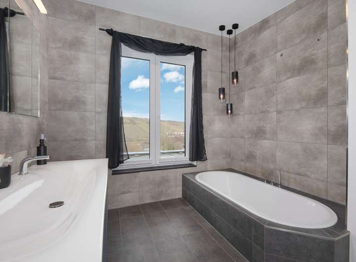 Das Obergeschoss bietet ein weiteres individuell nutzbares Zimmer, ein luxeriöses Badezimmer mit Doppelwaschbecken, Badewanne, Dusche und Fenster sowie ein Schlafzimmer mit Zugang zur eigenen Dachterrasse und herrlichem Blick auf die Weinberge. Ein Hauswirtschaftsraum sorgt für zusätzlichen Komfort und Stauraum.