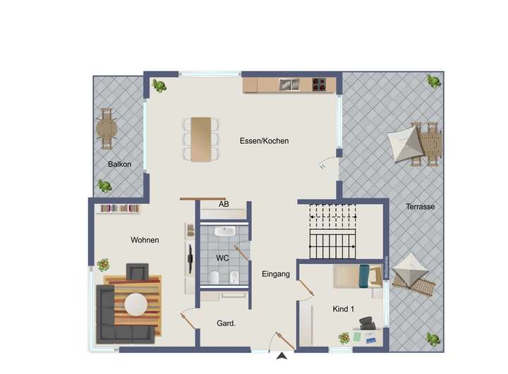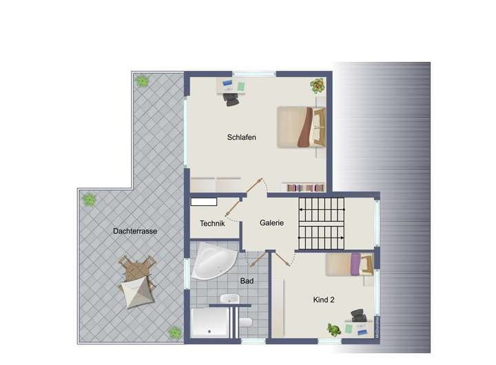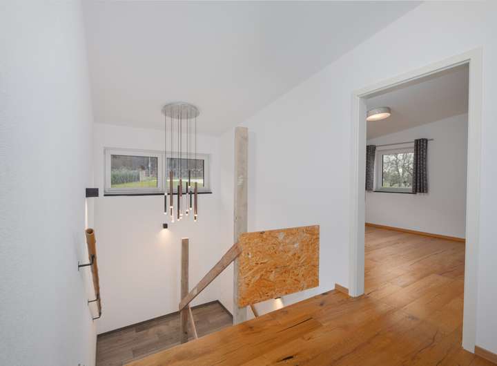 Die Außenanlagen – darunter (Dach-)Terrassenflächen, Eingangsbereich sowie Treppengeländer im Innen- und Außenbereich – sind teilweise noch fertigzustellen. Ein Teil des benötigten Materials ist bereits vorhanden, sodass die Arbeiten individuell nach eigenen Vorstellungen abgeschlossen werden können.