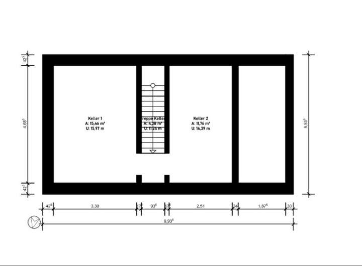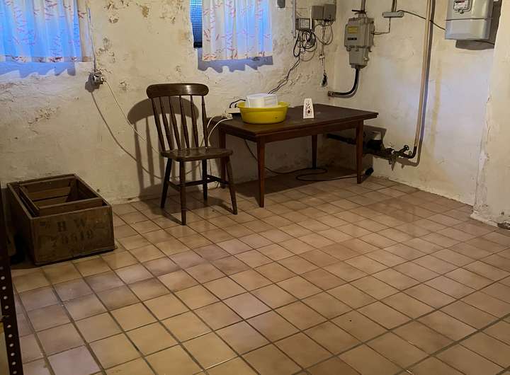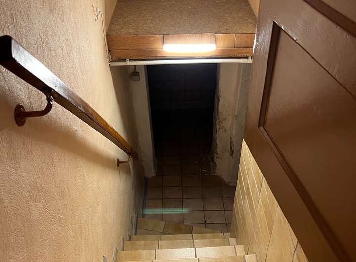 Es gibt einen vorderen Eingang, der direkt in einen kleinen Flur mündet. Hier führt die Treppe ins Obergeschoss. Links schließt sich ein gut geschnittenes Wohnzimmer an, rechts gelangt man in ein Durchgangszimmer, welches sich hervorragend als Esszimmer nutzen lässt. Von diesem Zimmer gelangt man durch eine Schiebetür in die Küche. Ebenfalls vom Esszimmer aus erreicht man den Keller. Dieser befindet sich nur unter dem 1920 erbauten Teil des Hauses und besteht im Wesentlichen aus zwei Kellerräumen mit kleineren Nischen und Abteilungen. Der Keller weist nur eine geringe Deckenhöhe auf und ist nur als Lagerkeller geeignet.