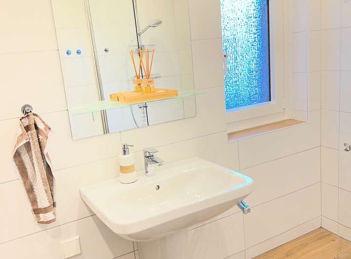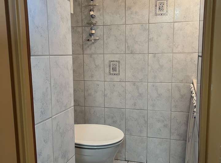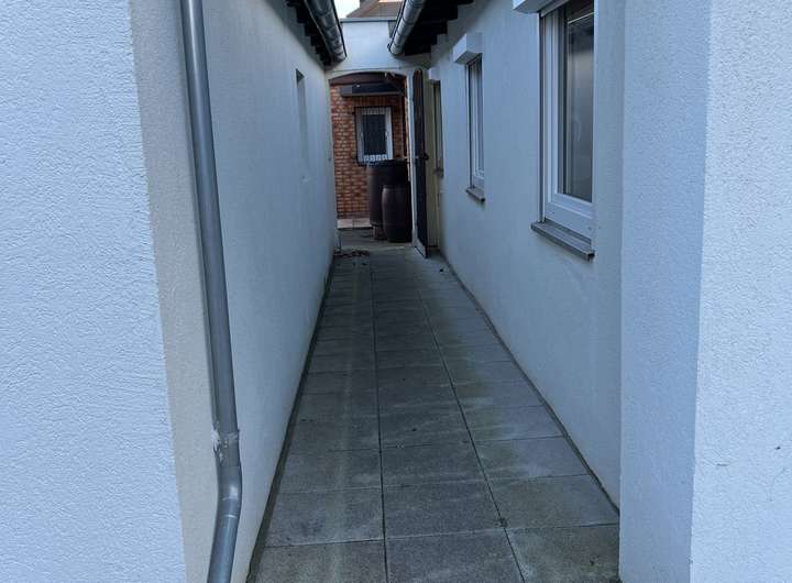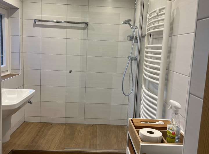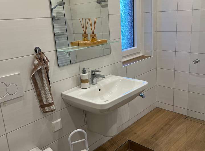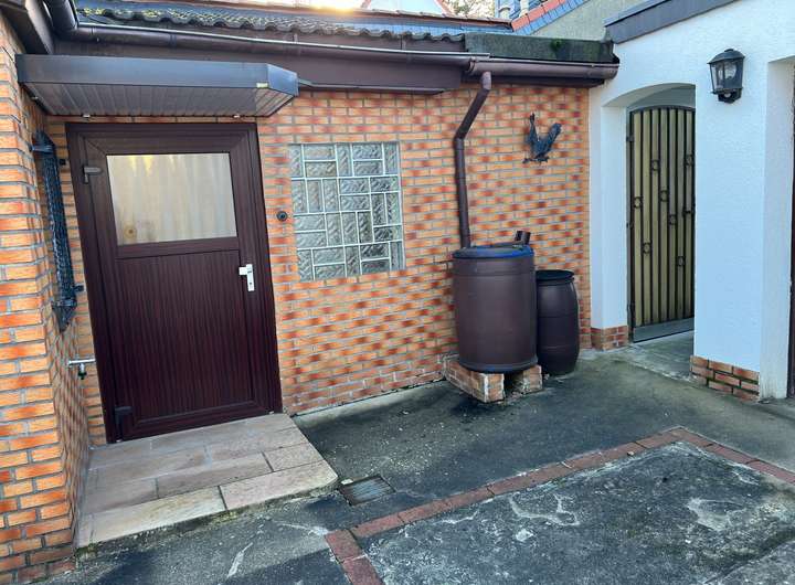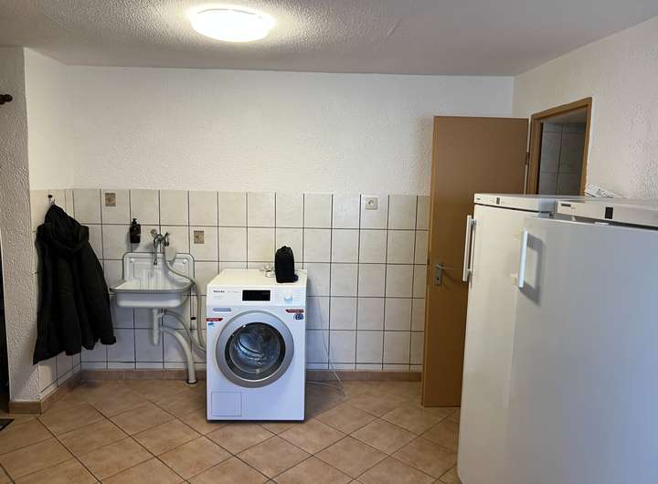 Von der Küche erreicht man über eine kleine Treppe den 1950 angebauten Teil. Man gelangt direkt in einen als Hauswirtschaftsraum genutzten Raum. Von diesem geht das erst neu ausgebaute und barrierearme Bad ab. Ebenfalls erreicht man hier das praktische Gäste-WC. Weiterhin liegt hier der zweite, als Haupteingang genutzte, Eingang. Dieser führt direkt auf den Hof und zur Garage. Einkäufe lassen sich so schnell und ohne großen Aufwand ins Haus schaffen.