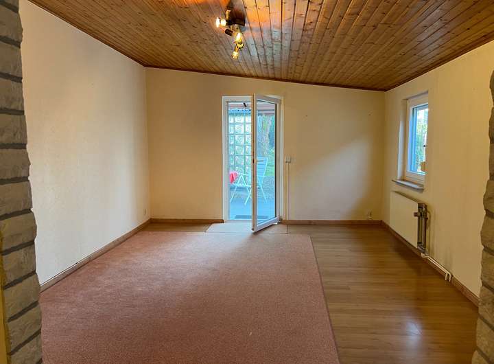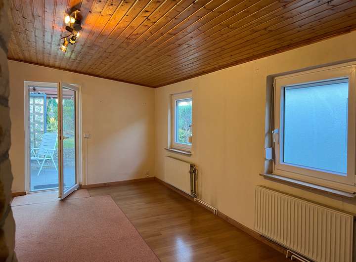 Hinter dem Hauswirtschaftraum befindet sich eine weiterer Durchgangsraum und im Anschluss das Gartenzimmer mit Ausgang zur überdachten Terrasse. Hier bietet sich die Einrichtung eines geräumigen Wohnzimmers an.