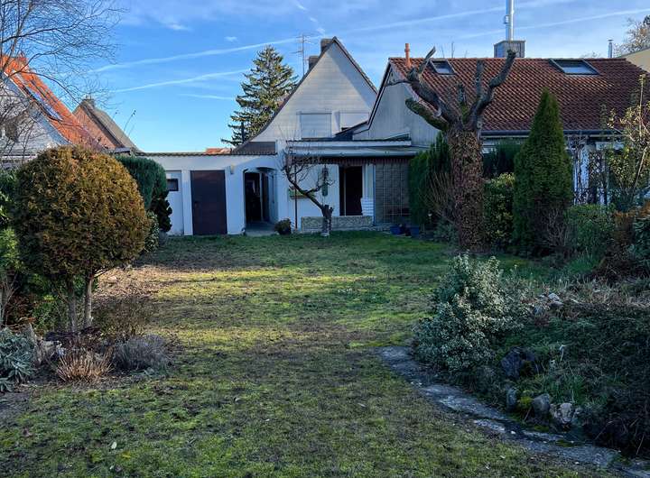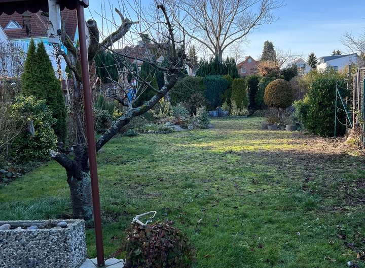 Die in den 20er-Jahren erbaute Doppelhaushälfte liegt in Ost-West-Ausrichtung auf einem schmalen Grundstück. Im hinteren Bereich schließt sich der hübsch angelegte Garten zum Westen hin an. Hier kann man herrlich die Nachmittags- und Abendstunden verbringen.