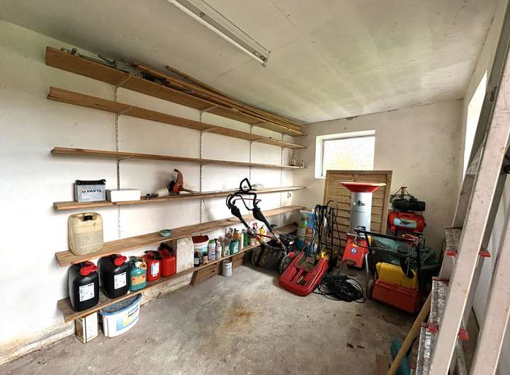 Zum Haus gehört zudem eine Garage mit zusätzlichem Geräteraum, geeignet als Werkstatt oder Hobbyraum.