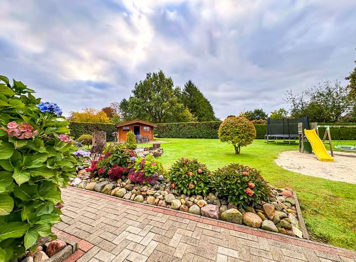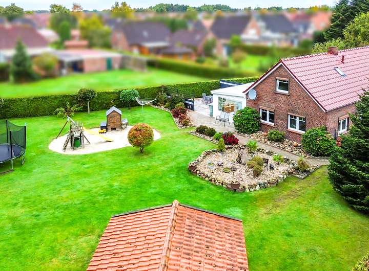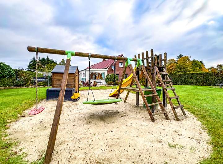 Das rund 1.600 m² große Grundstück ist ein kleines Paradies für Familien. Der eigene Kinderspielplatz lässt Kinderherzen höherschlagen, während Eltern auf der Terrasse den Sonnenuntergang genießen. Im gepflegten Garten blüht das Leben – und direkt neben dem Haus warten Pferdeboxen auf ihre neuen Bewohner. Ein Carport rundet das Ensemble harmonisch ab.