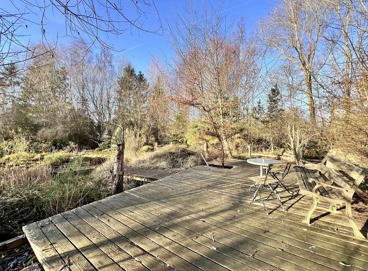 Dieses außergewöhnlich gestaltete, zweigeteilte Grundstück mit einer Gesamtfläche von 3.799 m² bietet ein hohes Maß an Privatsphäre, Naturverbundenheit und gestalterischer Qualität. Das Grundstück ist vollständig von einem hohen Erdwall umgeben, der mit Birken, Weiden und Schlehenbüschen bepflanzt wurde. Dadurch ist das Areal absolut dicht, nicht einsehbar und windgeschützt – ein geschützter Rückzugsort mit besonderer Atmosphäre.