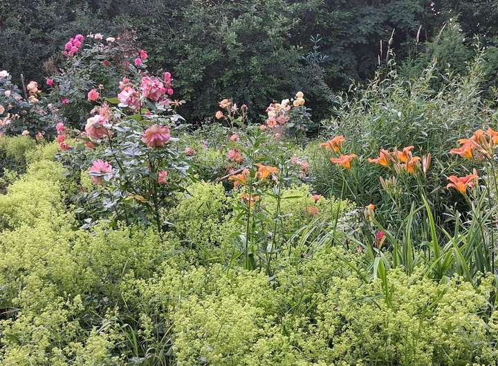 Angrenzend liegt eine großzügige Heidefläche, davor eine ausgedehnte Rosenpflanzung, die dem Grundstück Farbe, Duft und Struktur verleiht.