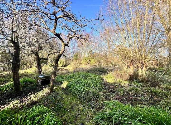 Das Gelände ist bewusst pflegeleicht und ohne klassische Rasenflächen angelegt. Schmale, geschwungene Wege führen durch die parkähnliche Landschaft und verbinden sonnige Bereiche mit angenehm schattigen Rückzugsorten. Eine große Weide sowie mehrere kleinere Weiden spenden natürlichen Schatten und verleihen dem Grundstück eine ruhige, gewachsene Ausstrahlung.