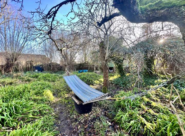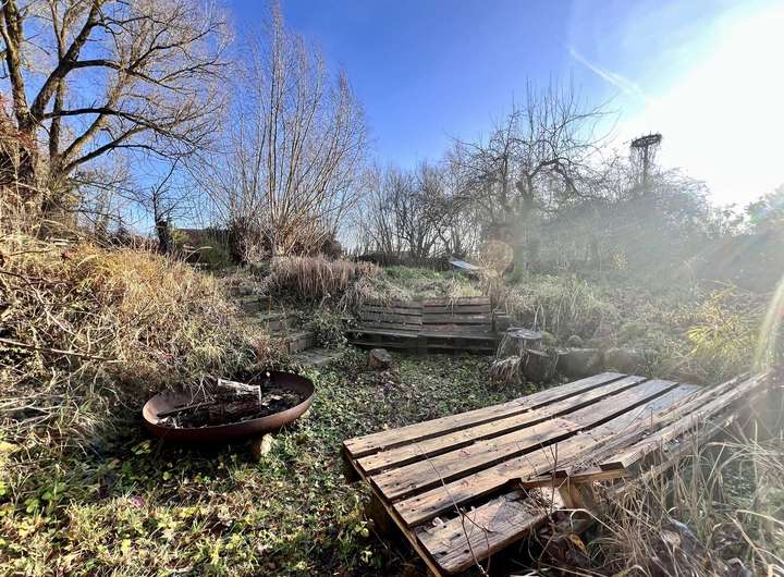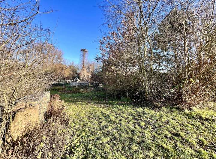 Der etwas kleinere Teil des Grundstücks mit ca. 1.200 m² ergänzt das Ensemble ideal. Hier befindet sich ein von wildem Wein überwucherter Stamm mit einem Storchennest, drei kleine Eichen, zwei Nussbäume sowie zentral ein malerischer Quittenbaum und ein junger Pfirsichbaum. Aktuell sind drei Hochbeete angelegt.