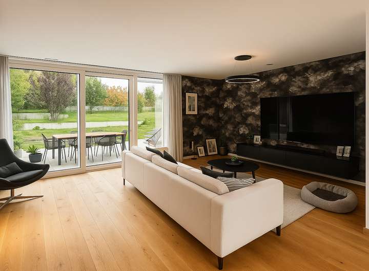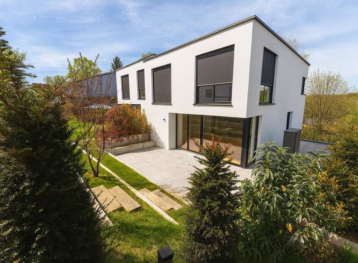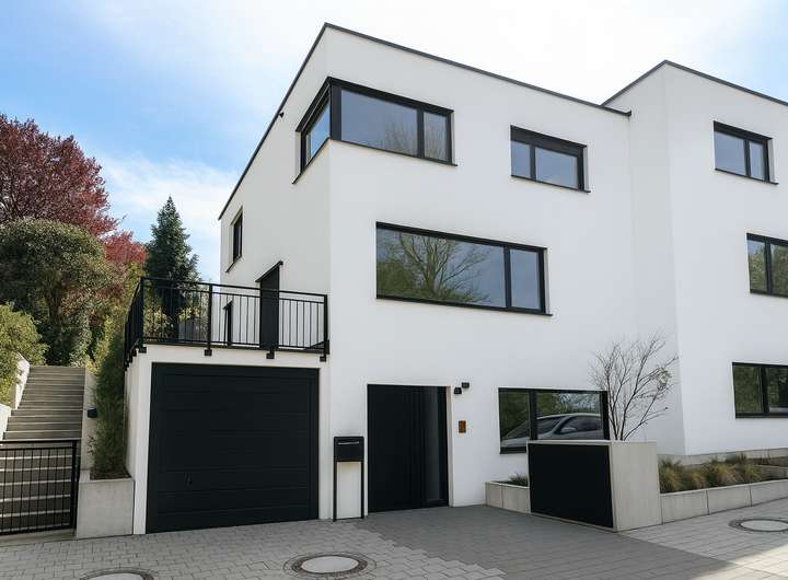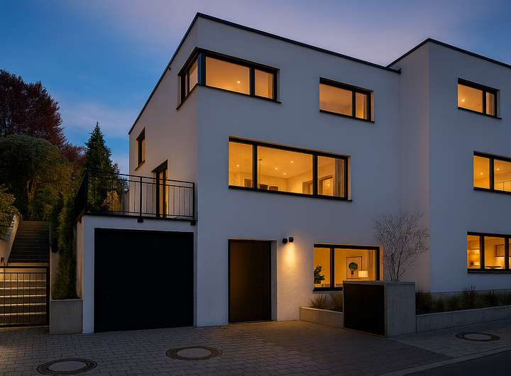 Bodentiefe Fenster mit Absturzsicherungen aus Glas sowie außergewöhnlich große Fensterflächen der Marke Josko verleihen dem von einem Architekten entworfenen Haus seine markante, zeitlose Eleganz. Auch die Eingangstür stammt von Josko und unterstreicht den hochwertigen Gesamtcharakter.
