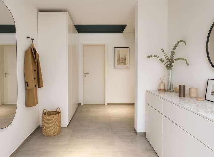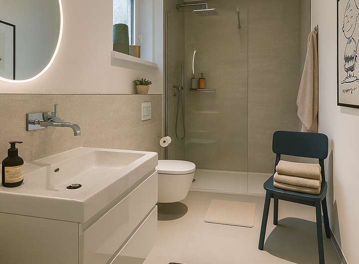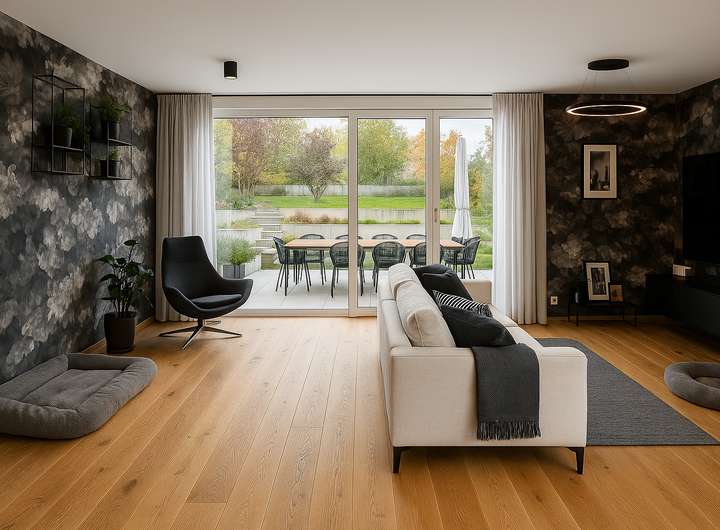 warme Eichendielenböden in Kombination mit großformatigen Fliesen (120 × 120 cm sowie 80 × 80 cm) schaffen eine harmonische Verbindung aus Natürlichkeit und Modernität.