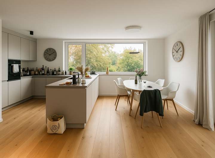 Die großzügige Wohnküche bildet mit dem angrenzenden Wohnzimmer das kommunikative Herzstück des Hauses.