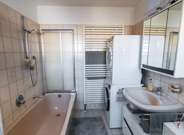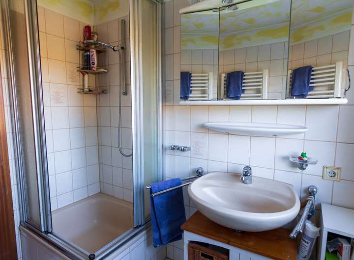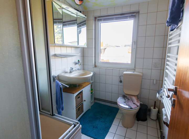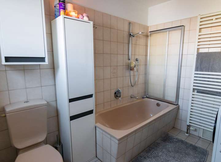 Wannenbad im EG mit hellen Wand- und Bodenfliesen ausgestattet aus ca. 1988, Duschbad zugänglich vom Schlafzimmer aus ca. 1988
