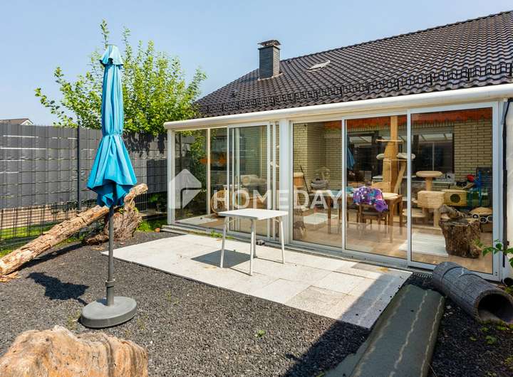 Der Außenbereich überzeugt durch seine Vielseitigkeit und lädt zum Entspannen und Verweilen ein. Zur Straße hin bietet er eine großzügige Sonnenterrasse, ein lichtdurchfluteter Wintergarten sowie ein gepflegter Steingarten mit Grünflächen mit zahlreichen Möglichkeiten für Erholung und Freizeitgestaltung. Hinter dem Haus erwartet Sie ein weitläufiger, grüner Gartenbereich. Für Fahrzeuge stehen eine Doppelgarage, eine Garage und mindestens zwei weitere Außenstellplätze zur Verfügung.