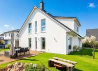 Bist du bereit für deinen neuen Lebensabschnitt? Bereits beim Ankommen wird dir bewusst, welchen Komfort im Alltag du zukünftig genießen darfst: Dich empfängt eine großzügige Einfahrt mit Doppelcarport und weiteren Stellplätzen - alles wirkt aufgeräumt und einladend. Der Eingang selbst ist funktional und durchdacht: Eine überdachte Haustür, Platz für Schuhe und Jacken sowie direkter Zugang zum Hauswirtschaftsraum sorgen für einen praktischen Start in dein Zuhause. Von hier aus geht es in den Familienbereich oder direkt nach oben in die Einliegerwohnung. Hinter dem Eingangsbereich führt sich ein großzügiger Flur in alle Räume des Erdgeschosses bevor er im Herzstück der Etage mündet: dem offene Wohn-, Ess- und Kochbereich mit bodentiefen Fenstern zur Terrasse und in den Garten. Hier spielt das Leben – der große Esstisch im Mittelpunkt, viel Platz zum Kochen, Reden, Lachen. Die Einbauküche ist modern ausgestattet und bestens integriert, während das Wohnzimmer der perfekte Ort für eine gemütliche Lounge für Filmabende oder entspannte Nachmittage ist. Daneben hast du übrigens die Möglichkeit, einen Kamin aufzustellen und dein Wochenende in Sachen Gemütlichkeit auf ein neues Level zu heben. Für den individuellen Rückzug findest du vier Zimmer: ...