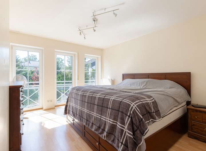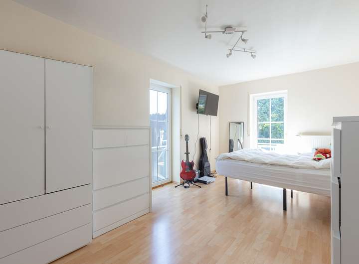 Im Obergeschoss stehen ein großes Elternschlafzimmer zur Verfügung sowie drei Kinderzimmer und ein großzügiges Badezimmer mit Badewanne, Dusche und Doppelwaschbecken.