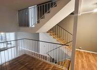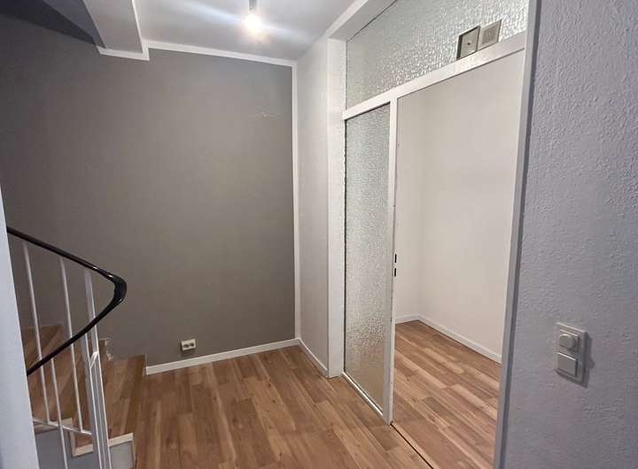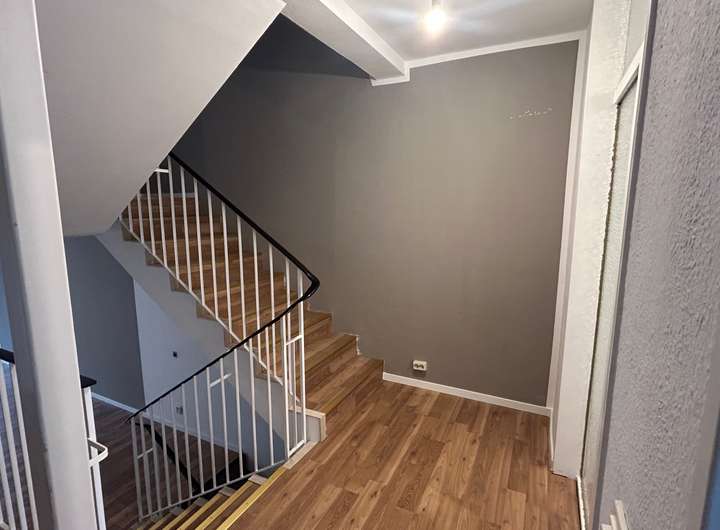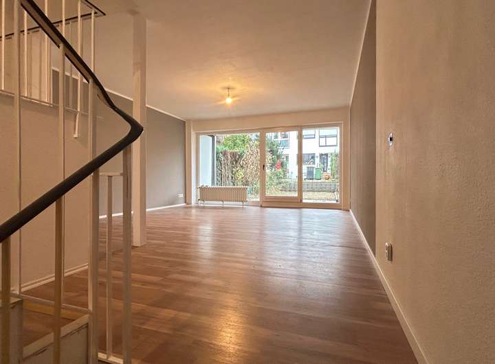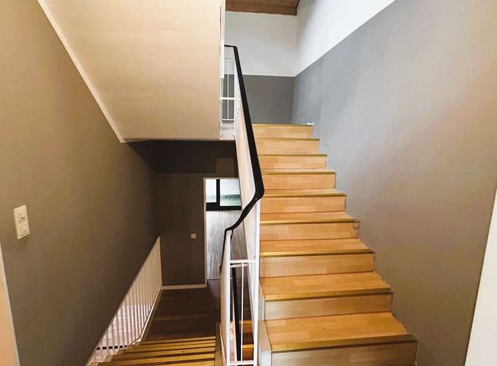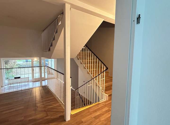 Es handelt sich um ein Reihenhaus der besonderen Art mit einer außergewöhnlichen Treppenhausstruktur, die die Geschoße miteinander verbindet und für ein atmosphärisches Licht im Haus sorgt.
