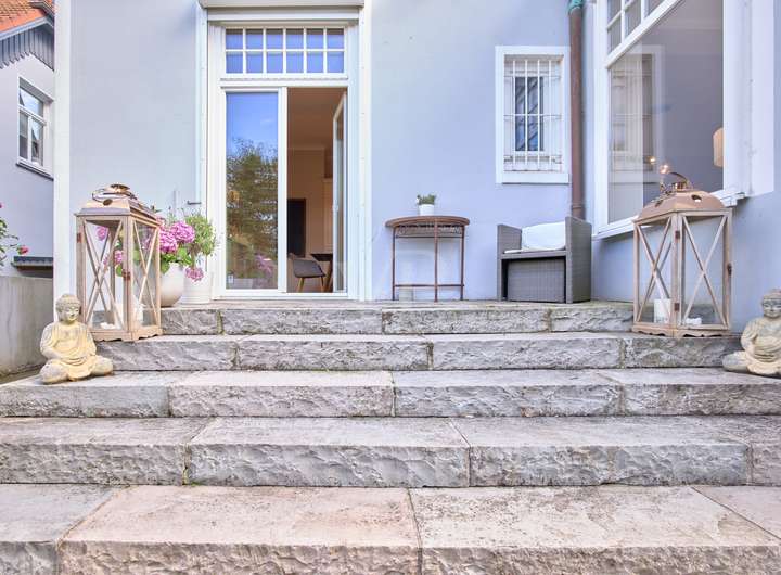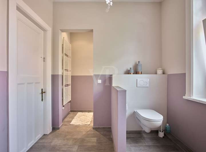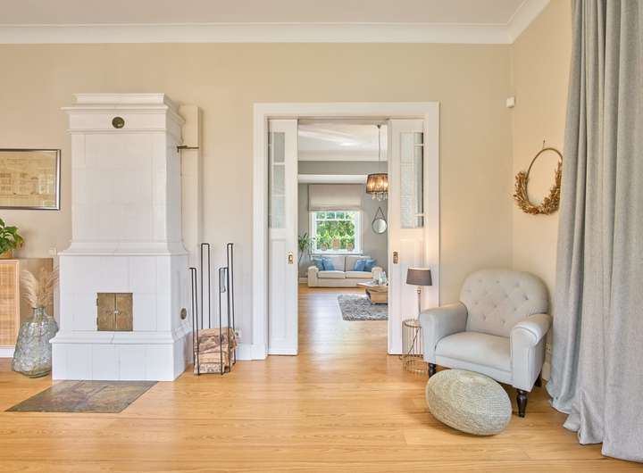 Die Villa begeistert auf den ersten Blick mit ihrer hochwertigen Ausstattung und einer einladenden Behaglichkeit. Das Erdgeschoss verfügt über eine große, moderne Wohnküche mit Zugang zum Terrassenbereich, ein helles Wohnzimmer mit einem gemütlichen Wintergarten und einem stilvollen Kachelofen sowie ein weiteres Zimmer mit Stuck, das durch eine Original-Holzschiebetür abgetrennt ist. Neben der großzügigen Eingangshalle finden Sie auf dieser Etage auch ein modernisiertes Gäste-WC und ein Gästezimmer, das sich auch perfekt als Büro eignet.