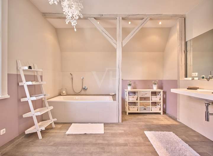 Im zweiten Obergeschoss befindet sich neben zwei Ankleidebereichen ein großes Schlafzimmer mit Vollbad en Suite. Die freigelegten Holzbalken untermauern im gesamten (Eltern-)Bereich die Gemütlichkeit. Die beiden Bäder werden mit einer Fußbodenheizung erwärmt.