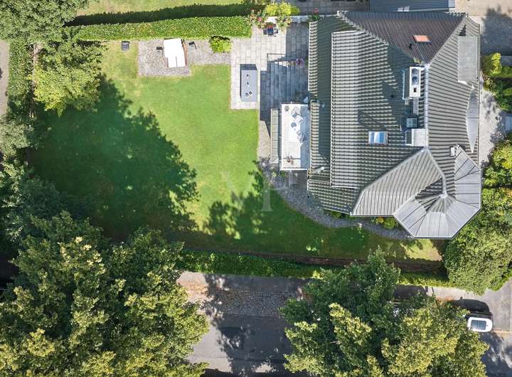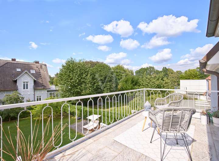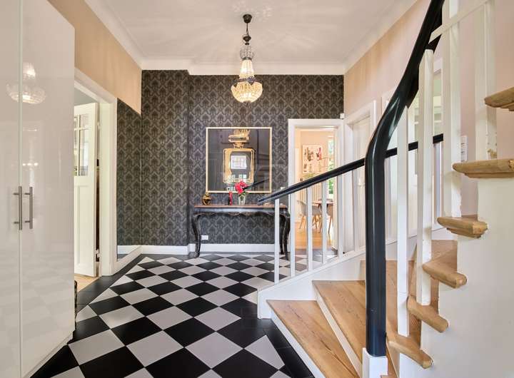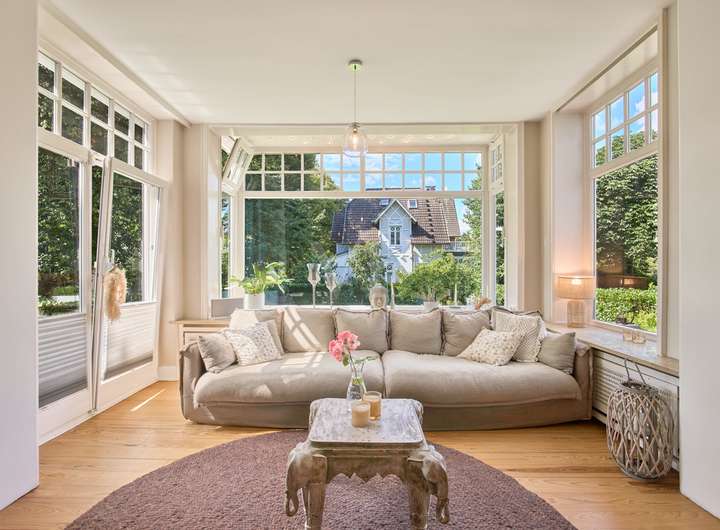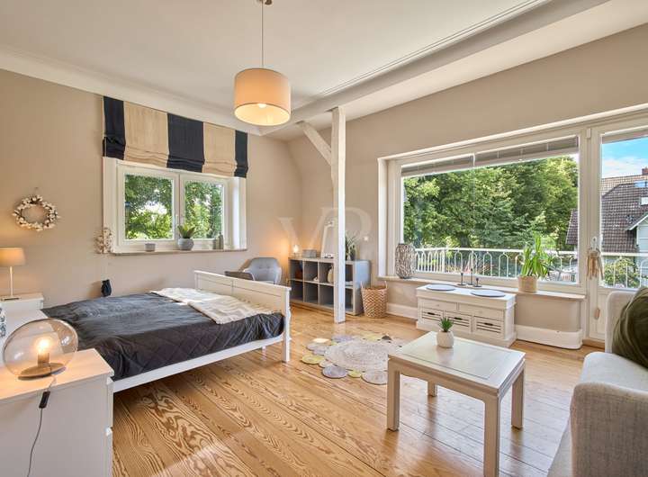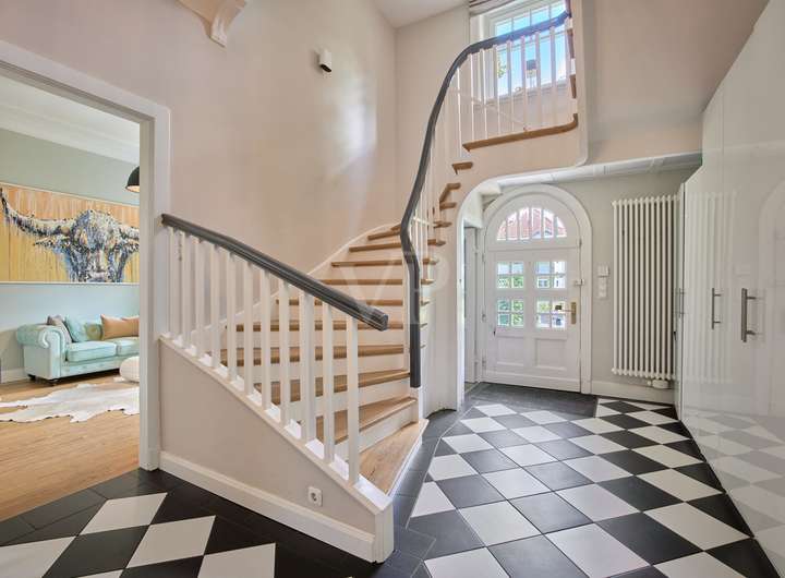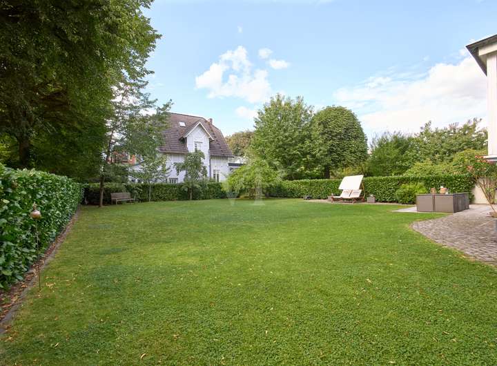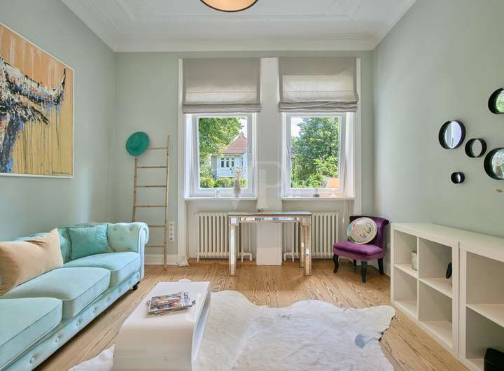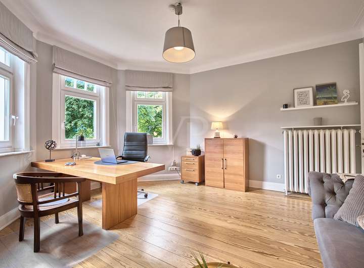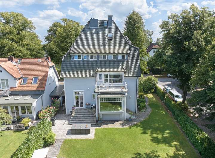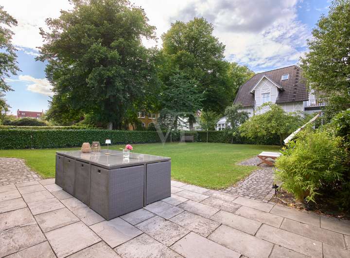 Diese elegante Jugendstilvilla wurde 1913 erbaut und im Jahr 2012 aufwendig saniert. Sie ist denkmalgeschützt und besticht durch ihre architektonische Schönheit. Die großzügigen und hellen Räume im Inneren des Hauses werden Sie überzeugen. Die zahlreichen originalen Stilelemente wie Sprossenfenster, Holztreppe, Türen, Stuck und Dielenboden wurden fachgerecht restauriert oder erneuert und mit modernen Elementen sowie Einbauten geschmackvoll kombiniert. Das größte und exklusivste Haus im Ensemble befindet sich in einer ruhigen Wohnlage im Grünen und verfügt über einen idyllischen Garten mit schönen Außensitzplätzen auf einem 870 m² großen Eckgrundstück.