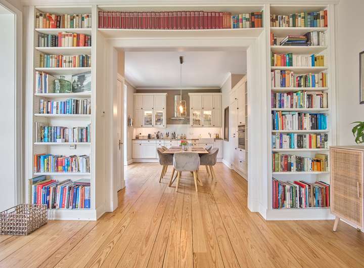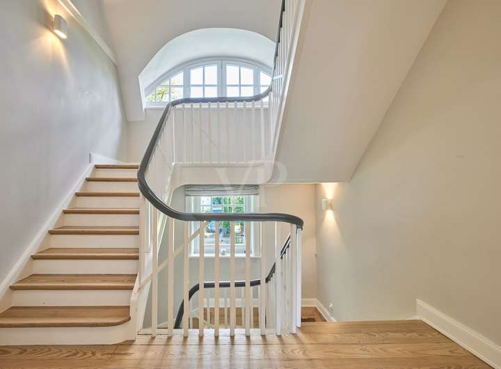 * Stilelemente wie Stuck, Holztüren, Sprossen- und Rundbogenfenster, Pitchpine und Holztreppe