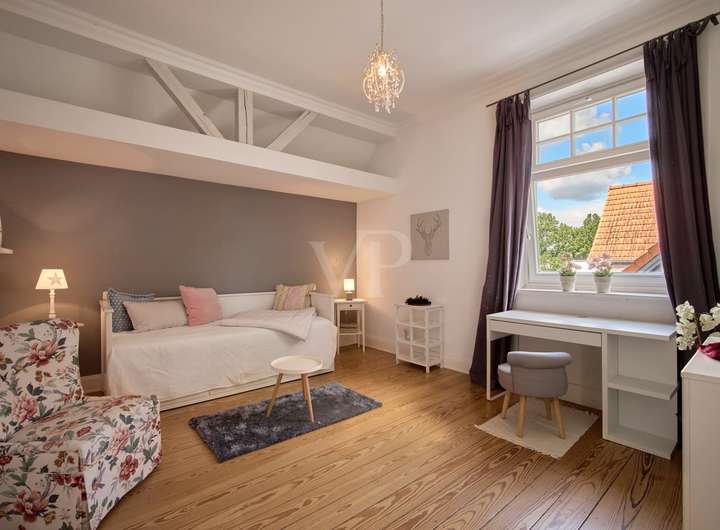 Über eine beeindruckende Holztreppe gelangen Sie in die Obergeschosse, wo Ihnen und Ihrer Familie im ersten Obergeschoss drei großzügig geschnittene Kinderzimmer zur Verfügung stehen. Jedes dieser Zimmer hat einen besonderen und individuellen Charme: Eines verfügt über einen separaten Ankleideraum, ein Anderes über einen großen Sonnenbalkon und das Erkerzimmer über eine Loggia. Diese Ebene bietet zudem ein helles, modernes Badezimmer mit Dusche und Badewanne.