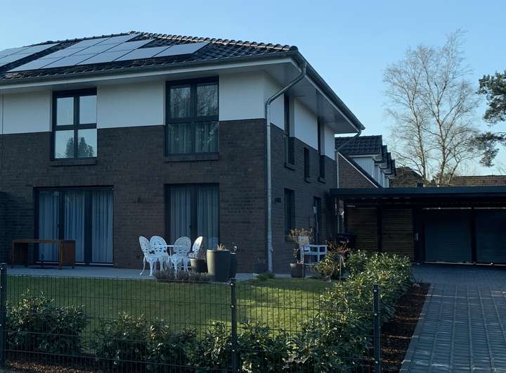 Dieses hochwertige KfW-Effizienzhaus 40 Plus befindet sich im beliebten Buchholzer Ortsteil Steinbeck und überzeugt durch ein modernes, zeitloses Erscheinungsbild, eine durchdachte Raumaufteilung sowie eine hochwertige Ausstattung. Das Haus bietet ideale Voraussetzungen für komfortables Wohnen in ruhiger, familienfreundlicher Umgebung. Bereits im Erdgeschoss wird das klare Wohnkonzept sichtbar: Der großzügige, offen gestaltete Wohn-/Ess-/Küchenbereich bildet das Herzstück des Hauses und schafft eine angenehme Verbindung zwischen Kochen, Essen und Wohnen. Die moderne, weiße Komfort-Einbauküche mit Bora-Induktionskochfeld und integriertem Kochfeldabzug ist im Mietangebot enthalten und fügt sich harmonisch in das Gesamtbild ein. Teilweise bodentiefe Fenster sorgen für eine helle, freundliche Atmosphäre und ermöglichen den direkten Zugang zur sonnigen Süd-Terrasse. Ein stilvolles Gäste-WC ergänzt diese Wohnebene sinnvoll. Die gemauerte und verblendete Terrassenabtrennung bietet optimalen Sichtschutz und schafft gemeinsam mit dem gepflegten Garten einen privaten Rückzugsort. Im Obergeschoss stehen drei helle Schlafzimmer sowie ein modernes, großzügig geschnittenes Vollbad in zeitlosem Design zur Verfügung. Hochwertiger Vinyldesignboden und moderne Fliesen unterstreichen den gehobenen Ausstattungsstandard. Im Erdgeschoss, Obergeschoss sowie im wohnlich ausgebauten Untergeschoss sorgt eine Fußbodenheizung in Kombination mit einer kontrollierten Be- und Entlüftung für ein angenehmes Raumklima. Der Keller bietet neben zusätzlichem Stauraum einen weiteren, gut belichteten Wohnraum, der sich ideal als Home-Office, Hobby- oder Gästezimmer nutzen lässt. Das Haus entspricht energetisch dem aktuellen Stand der Technik. Die Beheizung erfolgt über eine Wärmepumpe in Kombination mit einer Photovoltaikanlage. Ein Doppelcarport mit integriertem Abstellraum,bietet ausreichend Platz für Fahrräder & Gartengeräte. (Elektrische Rollläden, Wallbox Anschluss möglich).