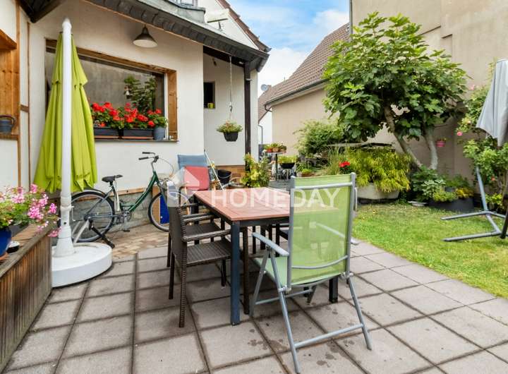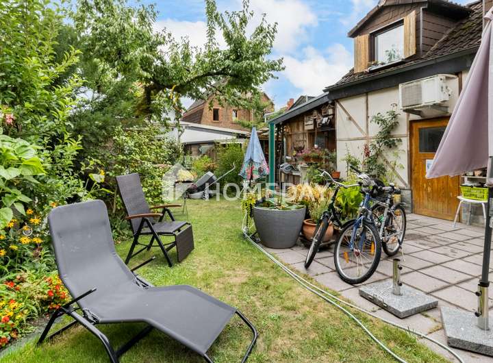 Der Außenbereich überzeugt durch einen liebevoll angelegten, pflegeleichten Garten und eine rund 25 Quadratmeter große Terrasse mit östlicher Ausrichtung, die zu sonnigen Stunden im Freien einlädt. Ein Stellplatz auf dem Grundstück sorgt für bequeme Parkmöglichkeiten.