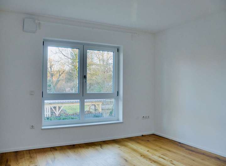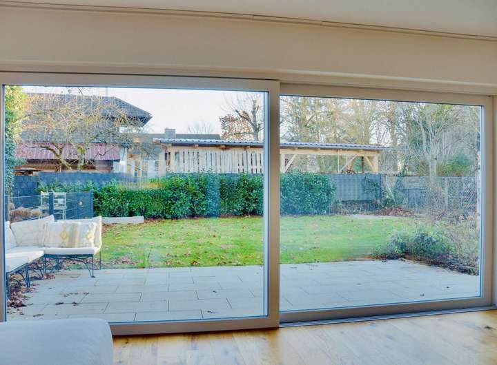 - Überwiegend bodentiefe Holz-Alu-Fenster (Innen mattweiß lackiert) mit 3-fach-Verglasung