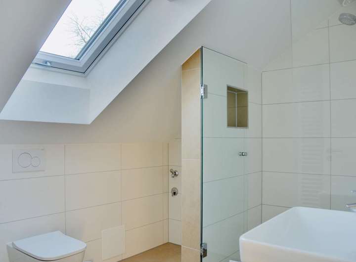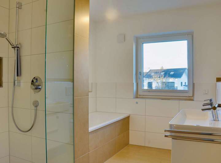- Bäder, gestaltet mit beigefarbenem großformatigem Feinstein, bodengleichen Duschen und Echtglas-Duschabtrennungen sowie zusätzlichen Handtuchheizkörpern