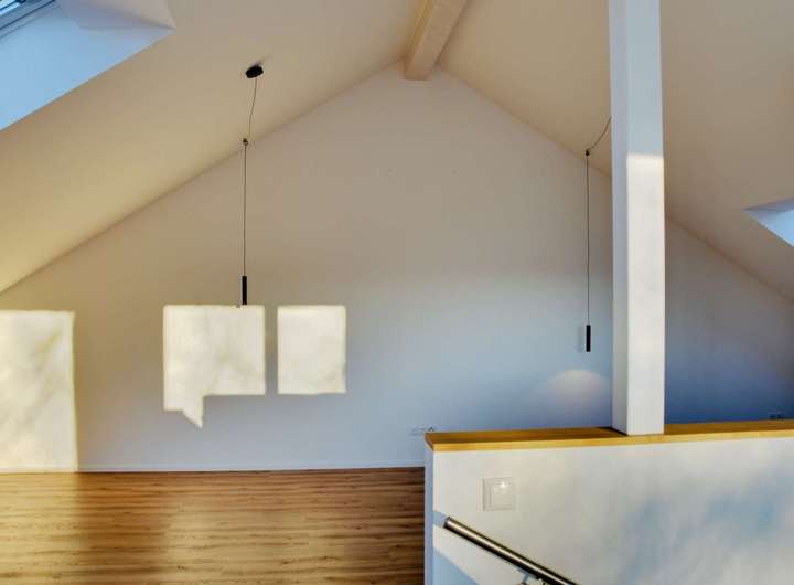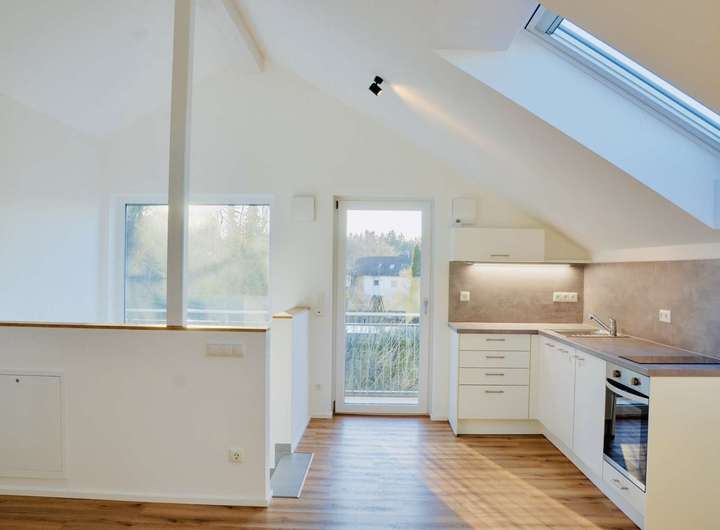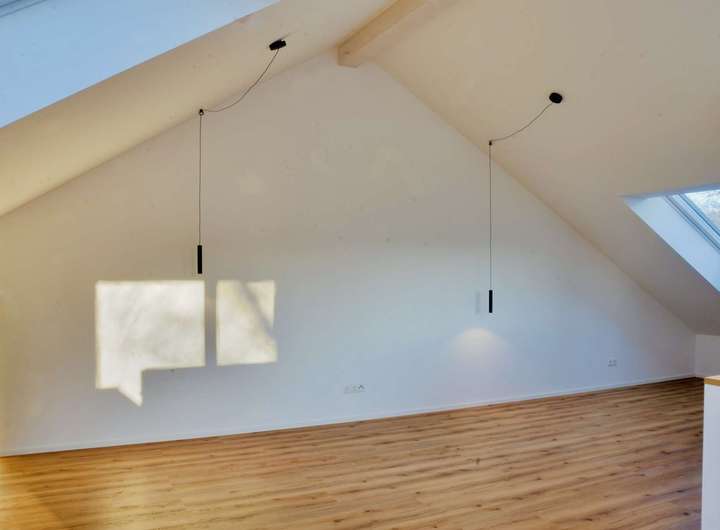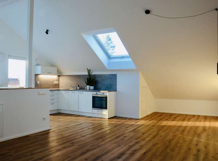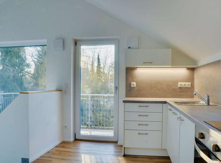 Das zusätzliche Dachstudio (ca. 38m² ) ist sowohl von innen als auch über eine separate Aussentreppe erreichbar und somit ideal für Homeoffice oder Selbständige. Dieses verfügt über ein eigenes Badezimmer mit Dusche und eine offene Küche. Ein eigener Balkon mit einem herrlichem Blick ins Grüne vervollständigt das Dachstudio.
